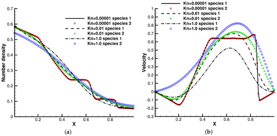 On the other hand, when is small, the characteristic scale of flow structures is basically much larger than the mean free path, and a macroscopic model is favored to describe the flow evolution collectively. In the hydrodynamic limit, the Euler and Navier–Stokes equations are routinely used, where different gas components present consistent collective behavior. Additional constitutive equations are required to track the evolution of different components. Such additional equations can be the equations for the volume fraction, mass fraction, or ratio of specific heats of a mixture [1,2]. It is a nontrivial task since the information of particle interactions among different components at the kinetic scale is lost during the coarse-grained process and should be modeled back to the macroscopic system in a consistent fashion.