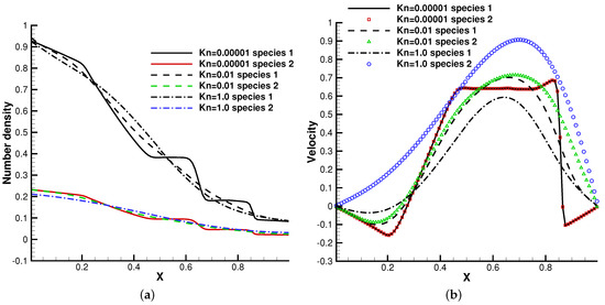 Next, we considered the discontinuous solutions developed in the hyperbolic system. The Sod shock tube problem was employed as the test case [7]. Similarly, two cases were considered with different molecular mass and number density ratios. In the first case, it was set up with , , and , in the second case. The initial condition was set as