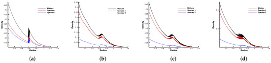 Figure 10 and Figure 11 plot the density contours and cross-sections of densities in all cells versus the radius with at different output times under different Knudsen numbers Figure 12 and Figure 13 present the same results with . As can be seen, in different flow regimes, different flow physics emerge around the Rayleigh–Taylor interface. In the continuum regime, the frequent intermolecular interactions provide the effective mechanism to quickly initiate and strengthen the flow mixing. As the Kn increases, the particle transport phenomena dominate the flow evolution, and thus, the particles have a greater chance of penetrating directly through the mixing layer into the inner zone. Therefore, the strength of the Rayleigh–Taylor instability is greatly reduced. Due to the fact that different gas components have different molecular masses, the profiles of different species can be different, corresponding to different Knudsen numbers. Figure 14 presents the density profiles of the two components at and . It is clear that, while the lighter components have already completed the density inversion, the heavy components are still in the mixing process. This is due to the fact that molecules with smaller masses have a faster mean speed. In all cases, it is clear that the hydrostatic solution is well preserved by the current well-balanced scheme, and the mixing of fluids occurs locally.