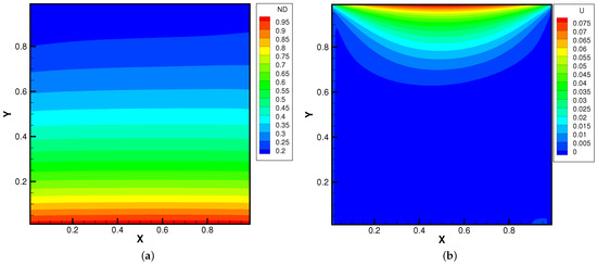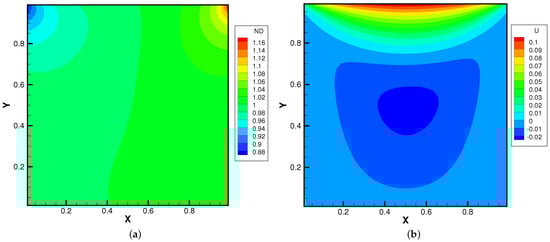 A binary gas mixture is enclosed by four walls with . The upper wall moves in a tangential direction with a velocity . The external force was set to be , respectively, in the negative y-direction. The magnitude of gravity is denoted by g. The initial density and pressure were set up with