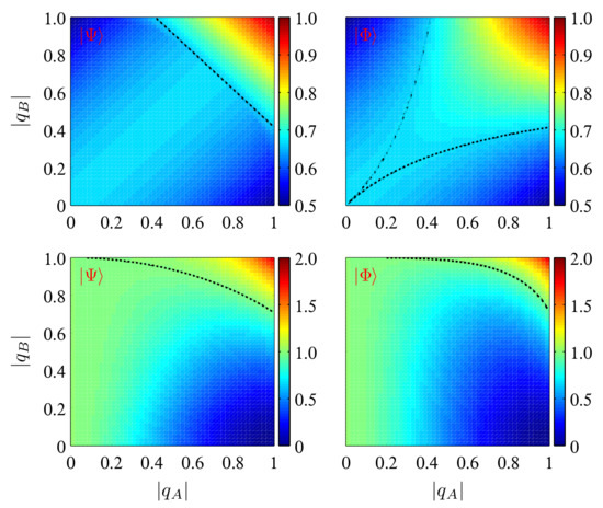For the given initial states, one can see from Equations (7) and (10) that both and are determined by and . By choosing , we show in Figure 1 their dependence on and , from which one can note that is symmetric with respect to . For the initial state , when , which decreases monotonically from to with the increase of . When , first increases to its peak value of and then decreases to a minimum, after which it increases gradually to at . Finally, for , always increases with an increase of . When considering , one still has when . However, when , first increases to a peak value larger than and then decreases to a minimum, and when , always increases monotonically with the increase of . Moreover, as is shown in the top two panels of Figure 1, for the initial state exceeds the classical limiting value of in an extended region of compared to that for .