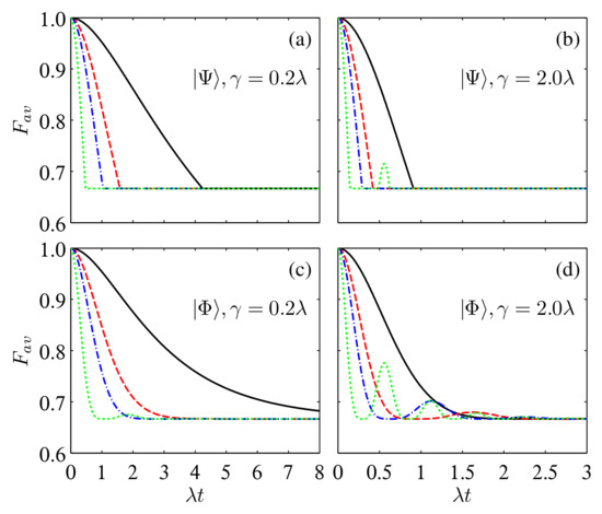 To summarize, we have investigated the efficiency of quantum teleportation and dense coding for two channel qubits coupled to their respective groups of multiple bosonic reservoirs. For those initial Bell-like states, we showed that both the average fidelity of teleportation and the dense coding capacity are determined by the decoherence factors () and we obtained the valid regions of in which the two protocols show quantum advantages. As explicit examples, we further considered the cases that the reservoirs have Lorentzian, sub-Ohmic, Ohmic, and super-Ohmic spectra. It is found that the non-Markovianity, due to the increasing number of reservoirs acting on each channel qubit, can induce revivals of the quantum advantages after their first disappearance, but the explicit processes are different for the teleportation and dense coding protocols. To be explicit, the variation of the trace distance between two optimal initial states (the contractiveness of which signifies the non-Markovian dynamics) does not always vary synchronously with and . There exist circumstances under which there is a delayed effect for the backflow of information on inducing the revivals of the quantum advantages of teleportation and dense coding. These results might provide a way for protecting the quantum advantages of the communication and computation protocols relying on non-Markovian evolutions, e.g., one could use the reservoir engineering technique to experimentally adjust the frequency distribution of a reservoir to the desired regimes [52,53,54,55]. Of course, we considered only the bosonic reservoirs with a single excitation. For the reservoirs whose spectral densities have low-frequency components, [ is large for ], such that one needs to go beyond the single excited subspace, their effects on the considered communication protocols may be different, and a further study on the details is still needed.