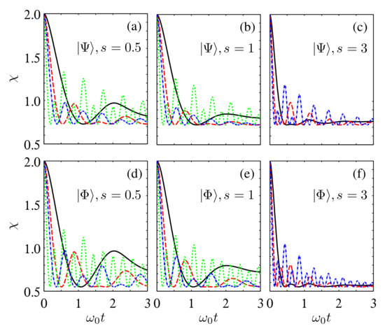 Time evolution of in the multiple sub-Ohmic, Ohmic, and super-Ohmic reservoirs for the initial states (a–c) and (d–f) with , , and . The solid black, dashed red, and dash-dotted blue lines correspond to , 4, and 8, respectively.