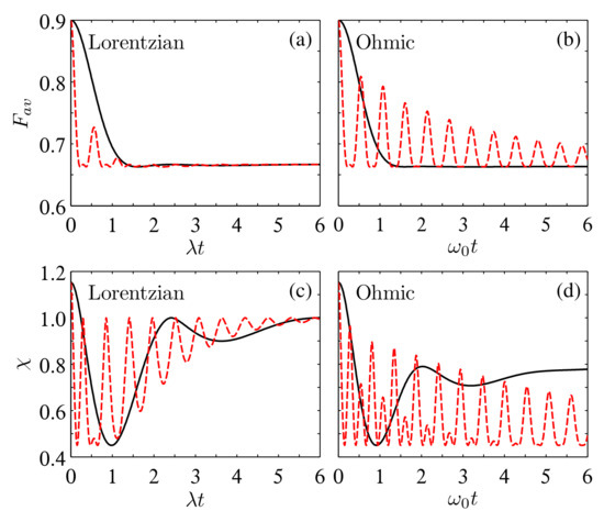 Time evolution of (a,b) and (c,d) in the multiple Lorentzian and Ohmic reservoirs for the initial state with , , , and . The solid black and dashed red lines correspond to and 32, respectively.
