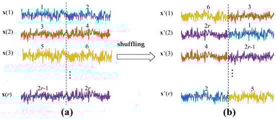 Generating the surrogate data. (a) are the source signals of independent repetition trials. Each trial is separated into two segments, these segments are shuffled in the ensemble members to ensure each segment is not in the same position as before, and then the surrogate data in (b) are generated.