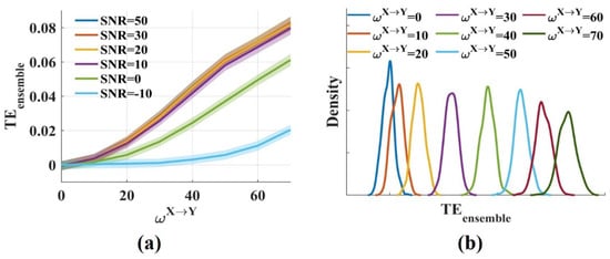 The results showed that the values fluctuated around 0 for and increased monotonically with from 0 to 70 (Figure 2a). Low, realistic noise (SNR = 50, 30, 20, 10 dB) had little effect on the values. The values decreased moderately when SNR was 0 dB, but for strong noise (SNR = −10 dB), the values reduced greatly. Figure 2b shows the distributions of the values for different when SNR was 20 dB. The distributions had some overlap, but the overlap areas were minimal. Therefore, different could be distinguished from the values. The novel in this work was consistent with the traditional method for measuring the interaction strength due to the same estimator they used. Above all, it suggests that the novel effectively measures the interaction strength even in the presence of noise.