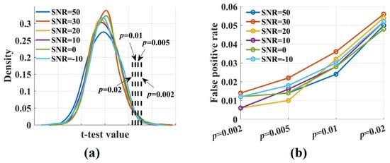 The densities of the t-test values and the false positive rate at different significance p levels. (a) The densities of the t-test values with , SNR = 50, 30, 20, 10, 0, −10 dB were broadly similar and normally distributed; (b) The false positive rate increased with the significance level-p from 0.002 to 0.02. It fluctuated around 0.01 when p was 0.002 and increased to 0.05 when p was 0.02. Noise had no impact on the proportion of false positive.