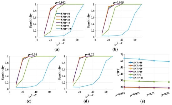 The sensitivity and the CDT values of the novel with varied significance p levels. (a–d) The sensitivity values of were plotted against the weight factor for different SNRs with the significance p level = 0.002, 0.005, 0.01, 0.02. The sensitivity values improved with p from 0.002 to 0.02. Moderate noise had a limited effect on the sensitivity. However, the sensitivity values were reduced for low SNR; (e) The CDT values (sensitivity = 0.8) were plotted against the significance p levels with varied SNRs. Moderate noises and p values had a limited effect on the CDT values, and low SNR increased them.