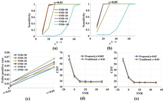 The sensitivity and the CDT values of the traditional when the significance level was 0.05 and 0.01, respectively. (a,b) The sensitivity values in the traditional method were increased with from 0.01 to 0.05. Moderate noises had a limited effect on sensitivity, but the sensitivity values dramatically reduced when SNR was −10 dB; (c) The false positive rate in the traditional fluctuated around 0.01 when the significance level was 0.01 and increased to 0.05 or higher when was 0.05; (d,e) The CDT values of the novel were compared with those of the traditional method for varied SNRs. For SNR = 50, 30, 20, 10, 0 dB, the differences in the CDT values for the two methods were tiny. The differences increased when SNR was −10 dB.