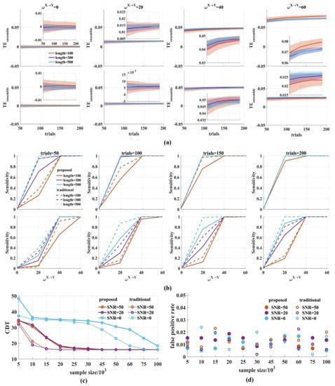 The performance of the novel with varied window lengths and number of trials. (a) We calculated the values for varied window lengths (100, 300, 500) and number of trials (50, 100, 150, 200) (top: SNR = 20 dB; bottom: SNR = 0 dB). In the upper (or bottom) right-hand corner is a detailed drawing. The values clustered around 0 for = 0 and increased monotonically for from 20 to 60, regardless of the SNR values. The variance of the values was reduced with the increase in the sample size. The solid lines and shaded areas represent the mean and the variance of the values, which were calculated 500 times by drawing a certain number of pairs from 1000 signal pairs; (b) The sensitivity of the novel was calculated. The solid lines are the sensitivity values of the novel and the dotted lines are those of the traditional method. With the increase in the sample size, the sensitivity improved (top: SNR = 20 dB; bottom: SNR = 0 dB); (c) The CDT values against the sample size with SNR = 50, 20, 0 dB. With the increase in samples, the CDT values reached their stable state in the novel , which was slower than that of the traditional ; (d) We obtained the false positive rates for different sample sizes with SNR = 50, 20, 0 dB. They fluctuated between 0 and 0.02 for the two methods regardless of the samples and noise. There were several values above 0.02 in the traditional method.