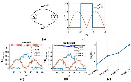 The ability and the time consumption of the novel in tracking the dynamic interaction process. (a,b) Signal pairs were generated with varying coupling strength. is the on/off boxcar and varies with the absolute value of a sinusoid; (c,d) The values for the novel and the traditional method could track the dynamic process of and . The solid blue and red circles indicated the significant interaction. (e) The time consumptions of the novel and the traditional on GPU and CPU, respectively. The time consumption was reduced by about two or three orders of magnitude compared with that of the traditional method. The pro. and tra. are the abbreviations of proposed and traditional, respectively.