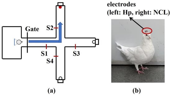 Diagrammatic sketch of a plus-maze and pigeon with implanted arrays. (a) The pigeons were trained to start from the waiting area, pass through the straight area, and turn left, forward, or right as the goal location light instructed. After a reward was consumed, they returned to the waiting area. S1, S2, S3, S4 are infrared sensors. (b) The microelectrode arrays were implanted at Hp and NCL.