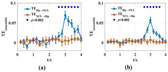 Local transfer entropy is a time-varying version of TE, which was proposed by Lizier to realize the local or pointwise interaction estimation, and TE can be expressed as an average of local transfer entropy []. In recent years, local transfer entropy has been used in neuroscience []. Ramón demonstrated that the local mutual information is suitable for measuring the dynamics of cross-frequency coupling in brain electrophysiological signals []. Local transfer entropy has been applied to explore the dynamic coupling of the phase–amplitude during seizures []. However, Sezen questions the local causality measure of local transfer entropy because the causal nature does not necessarily remain in each part []. In addition, there is high-frequency leakage into the local transfer entropy, and it is difficult to explain this phenomenon theoretically. The use of local transfer entropy to measure dynamic interaction needs further research. In this paper, local transfer entropy is not directly used to investigate the dynamic interaction between signal pairs. We used the characteristic that TE is the average value of the local transfer entropy for the statistical analysis in the novel .