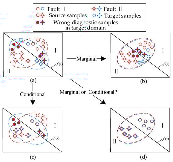 Intelligent fault diagnosis: (a) without dynamic distribution adaptation; (b) with marginal distribution adaptation; (c) with conditional distribution adaptation; and (d) with dynamic distribution adaptation.
