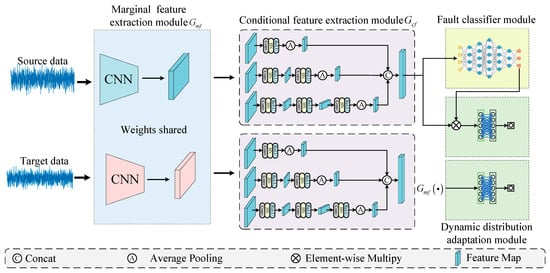 The structure of our DCMSDA model is shown in Figure 2. The deep convolutional multi-space dynamic distribution adaptation network consists of four parts, including the marginal feature extraction module, the conditional feature extraction module, the dynamic distribution adaptation module and the fault classification module. The two feature extraction modules are composed of multiple stacked convolutional layers; the fault classification module is a fully connected layer with Softmax activation function; and the dynamic distribution adaptation module contains two domain discriminators, which consist of three fully connected layers with Sigmoid activation function. Given the raw time–domain signal as input, the marginal and conditional feature extraction modules are used to extract the features of the marginal and conditional distributions, respectively. After that, the fault classification module classifies the extracted fault features and outputs the classification vectors. During the training process, the proposed dynamic distribution adaptation module uses two metrics to measure the distribution discrepancies of domains. Moreover, to calculate the adaptive coefficient, which dynamically guides the feature extraction modules to extract more domain-invariant features, two domain discriminators are constructed to determine the domain to which the above features belong. The primary transfer modules introduced in the model include the feature extraction modules and the dynamic distribution adaptation module, which are described in this Section 2.1. The training process of the model is described in detail in Section 2.2.