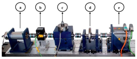 Experimental setup of PU: (a) electric motor; (b) torque measuring shaft; (c) rolling bearing test module; (d) flywheel; and (e) load motor.