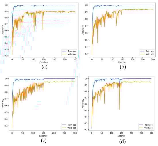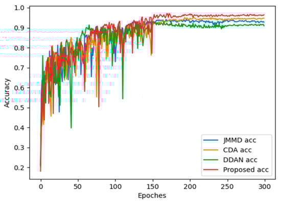 To analyze the experimental results concisely, we chose the DDAN method with dynamic distribution adaptation, the JAN method with the best effect based on statistical distance metric, the CDAN method with the best effect based on adversarial learning, and our proposed model, as comparisons. Figure 5 shows the accuracy curves of DDAN, JAN, CDAN and the proposed DCMSDA model in the source domain training and the target domain test under the 2→0 transfer task, the optimal transfer task. There was a gap in accuracy between the source-domain training and target-domain test (Valid), which indicated that the distribution discrepancies between domains led to a lower generalization performance. Thanks to the proposed transfer modules, our model exhibited the smallest gap. This proved that the proposed model was easier to apply to actual working conditions. Additionally, in terms of the stability of the test (Valid) accuracy convergence, the proposed model significantly outperformed other methods. Figure 6 visually compares the test (Valid) accuracy curves for the four methods above. As can be seen, the accuracy of the proposed model was significantly higher than other methods.