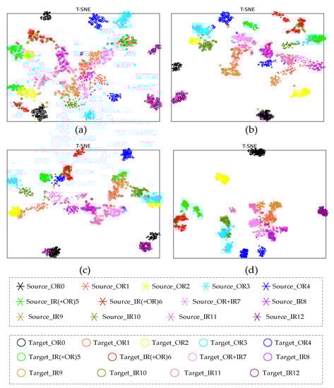 - The proposed DCMSDA model could extract representative domain-invariant features and exhibited excellent generalization performance because features of the source and target domains at the same fault category were closest. Specifically, as can be seen in Figure 7a–c, the three compared methods all closed the source domain and the target domain features of OR0, OR2 and IR12 faults unsuccessfully, but the proposed method closed them successfully, as shown in Figure 7d.
