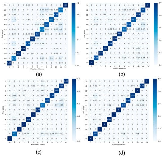 The confusion matrices of DDAN, JAN, CDAN and the proposed DCMSDA model were compared under the 2→0 transfer task. Firstly, Figure 8a shows that DDAN had the lowest classification accuracy. The results in Figure 8b,c show that JAN had higher accuracy on certain label classification tasks, such as faults with label 1, and CDAN had higher accuracy on certain label classification tasks, such as label 9 and label 11. In contrast, the proposed model had higher accuracy than several other models on all label classification tasks, as shown in Figure 8d. Secondly, the results in Figure 8a–c show that when detecting the complex faults with label 7, diagnostic accuracies of the compared models were significantly lower, with only 73% for DDAN, 80% for JAN, and 76% for CDAN. In contrast, the proposed DCMSDA model could increase the accuracy to 90%, as shown in Figure 8d. All experiment results showed that the proposed model had excellent classification performance to identify variable types of faults.
