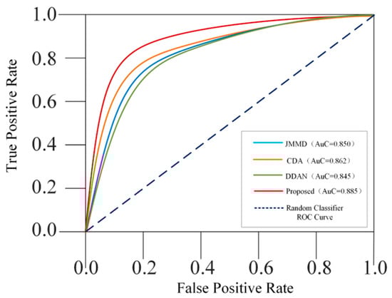 RoC curves of DDAN, JAN, CDAN and the proposed DCMSDA model were compared under the 2→0 transfer task, as shown in Figure 9. Here, we treated the Target_OR3 fault as the positive sample and the Target_OR4 fault as the negative sample. As can be seen, the proposed model had better classification performance because its RoC curve was closer to the coordinate point (0, 1), a point that only the perfect classifier would pass through. Moreover, we calculated the AuC value under each curve, as shown in the legend of Figure 9. The results showed that our model outperformed the other three models, as its AuC value was closer to 1.