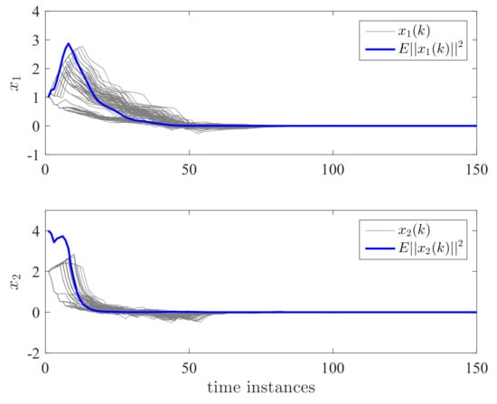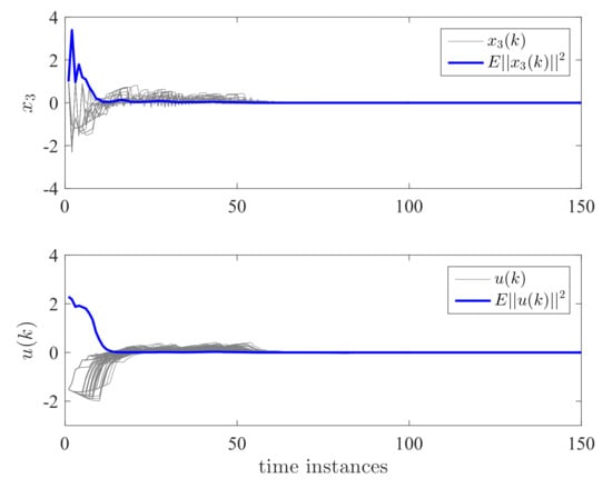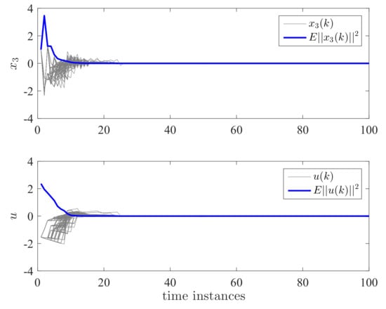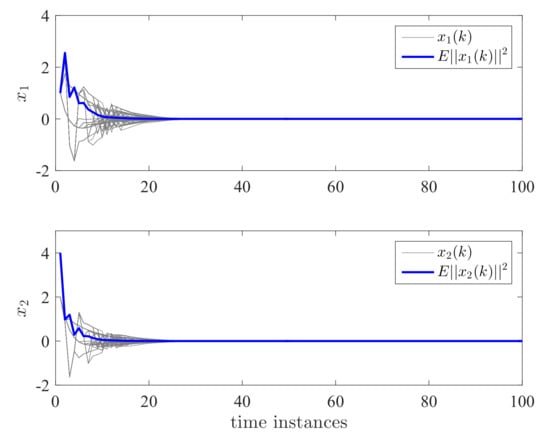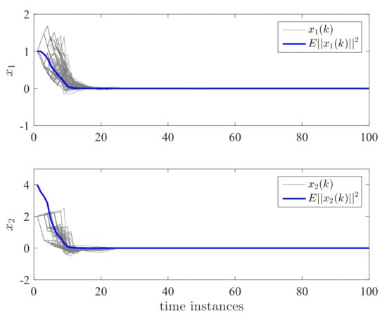 Markov jump systems are a typical class of stochastic switching systems  [,,,]. The stochastic switching law is described by a Markov process. Numerous works have been conducted on the Markov jump systems. For instance, Ref. [] considered the problem of state feedback stabilization for singular Markov jump systems by using the equivalent sets technique. In [], a sliding mode controller was designed for a Markov jump system with digital data transmission. More recently, Ref. [] considered the stabilization problem of a class of Markov jump systems with generally uncertain transition rates. Namely, the transition probability is time-varying and governed by another deterministic switching law []. In fact, the system in [] is a kind of dual switching systems []. By dual switching, it means that the systems contain both stochastic and deterministic switching law. Many practical systems can be described by dual switching systems. For example, consider a serve motor system. The motor may work in different situations, such as no load, external load, external inertia, etc. This can be represented by the deterministic switching. The fast time-varying parameters, such as from stochastic disturbance, abrupt failure, and noise, can be expressed as a stochastic switching sequence. Another application example is given by a multi-loop networked control system suffered from failures. The stochastic failures of the communication network can be expressed as a Markov chain, while the scheduling signal selects which control loop is currently attended. Due to this hybrid feature, the controller design problem becomes more difficult.