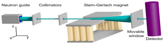 Figure 1 shows a schematic of the SG experiment with neutrons, as performed by Hamelin et al. [10]. Cold neutrons leaving the neutron guide impinge on a collimator positioned from the exit plane of the neutron guide. The selected neutrons impinge on a second collimator, placed from the first one. The strongly collimated beam of neutrons then passed through the SG magnet which is long. The distance between the second collimator and the exit plane of the SG magnet is . The direction of the neutrons leaving the SG magnet is selected by means of a meaning window. The distance between the exit plane of the SG magnet and the detector is .
