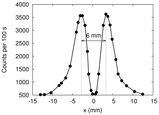 In Figure 2 we present some of the results reported in Ref. [10]. Clearly, the SG magnet causes the neutron beam to split in two well-defined beams, with their maxima of intensities separated by about . Note that the window (see Figure 1) in front of the detector moves in the x-direction only.