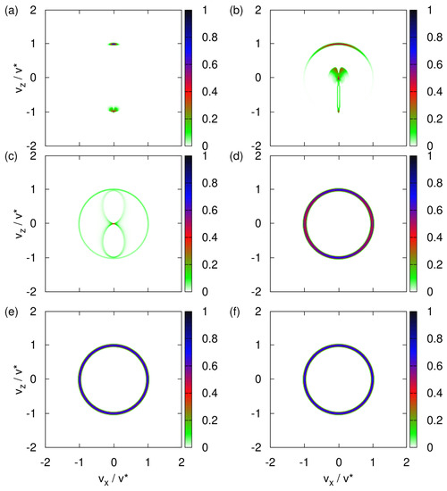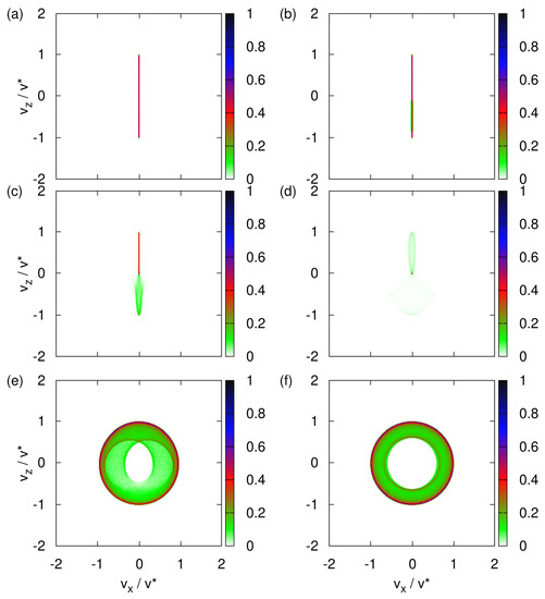 Next, we assume that the direction of the magnetic moment, represented by the three-dimensional spin vector , is uniformly distributed over the sphere. In different words, there is maximum uncertainty about the directions of magnetic moments of the neutrons emerging from the neutron guide (see Figure 1). With this initial condition of , the transverse velocity distribution changes drastically as the strength of the uniform magnetic field decreases from rather strong () to very weak (), as illustrated in Figure 3a–f.