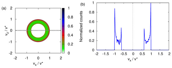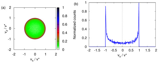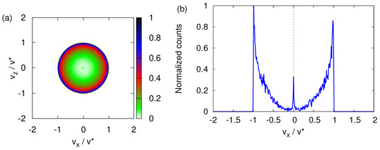 Finally, Figure 7 shows that performing the classical simulation using model parameters appropriate for imaginary silver particles instead of neutrons does not change the qualitative features of the transverse velocity distribution. Compared to neutrons (see Figure 4b), the main difference is that the transverse velocity distribution is more spread out over the circle with radius (see Figure 7b)