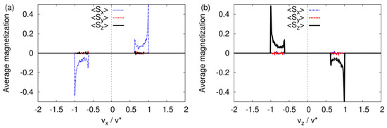 Histogram of the average of the three spin components in the transverse velocity distribution obtained by solving the classical equations of motion Equation (3) with the initial magnetic moments distributed randomly (see text). (a) Average calculated by integrating the spin data for . (b) Average calculated by integrating the spin data for .