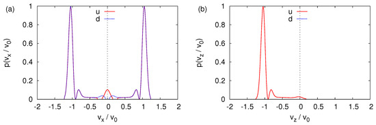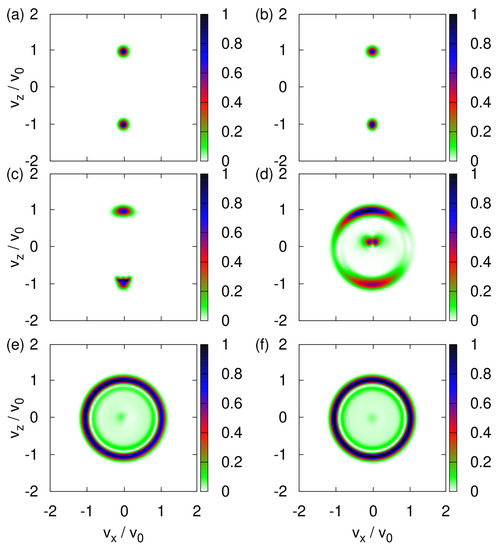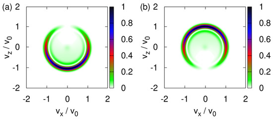 We study this aspect by solving the TDPE for the initial state given by Equation (A27) with , that is for the initial spin states and and . The transverse velocity distributions are shown in Figure 9a,b. If the initial spin state is (), the wave packet dominantly propagates along the -direction and -direction; see Figure 9a,b, respectively. The term causes both components of the wave function to spread in all directions, producing the sickle-like shapes in Figure 9a,b. Not surprisingly, the sum of Figure 9a,b yields an image that looks very much like Figure 8f.