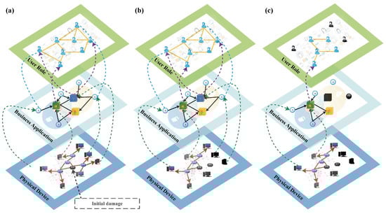 The transmission process of perturbations can be summarized as follows. In Figure 2, all six types of nodes have a functional task to carry, and we define a node as alive when it performs its function normally; a node is considered to be in a failed state when it loses its function due to perturbation or is separated from the largest network component in this layer. In the three-layer network model, the initial state of all nodes is set to the surviving state. When a node becomes disabled, it will be removed from the network. The initial perturbation is set to a routing device () within the physical device layer, and the perturbation simulates a functional failure of the routing device due to hard damage or system crash. As the routing device loses functionality, the routing device connected to it is removed from the network along with its largest component, which in turn prevents servers and user terminals that rely on its routing functionality from accessing the physical device network, and a collection of associated failed nodes occurs at this layer. As a result, all relevant business systems and access nodes lose their deployment environment and cannot operate normally, falling into a failed state, further causing user roles within the business system to freeze and unable to perform normal business operations.