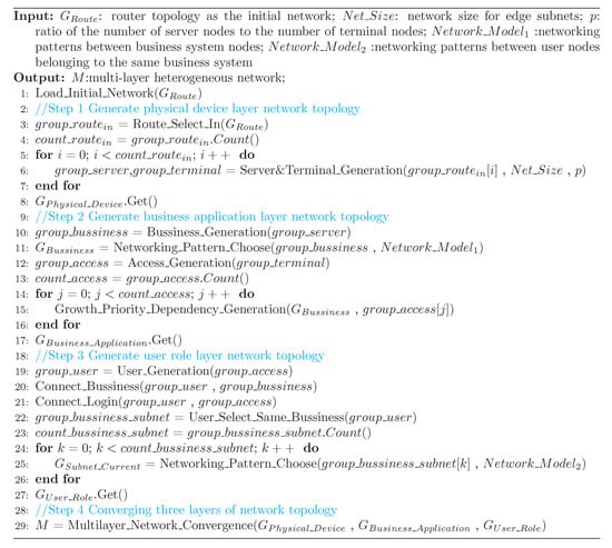 The heuristic algorithm provides a generic instance generation framework for generating multilayer network models in the context of Internet connectivity patterns, which can be set to the networking patterns according to the application context of the actual network and better simulate the evolution of a three-layer network. Analyzing the complexity of this heuristic algorithm, we can find that in the process of multilayer network generation, the underlying physical device layer network provides the basis for building the whole multilayer network, and the connection pattern between the business application layer network and the user role layer determines the complexity of the whole network model, while the connection pattern within the business application layer mainly depends on the application context, and the connection pattern within the user role layer network mainly depends on the network users’ social behavior. The heuristic algorithm has good scalability and facilitates further matching with various network connection patterns.
