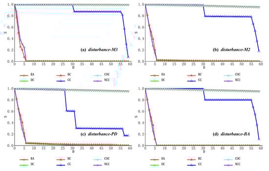 In addition to the random strategy of randomly ranking the importance of nodes (labeled ), the key node ranking indicators selected for the experiment also include degree centrality (labeled ) [], betweenness centrality (labeled ) [], closeness centrality (labeled ) [], clustering coefficient (labeled ) [] and network constraint coefficient (labeled ) [].