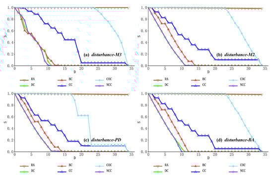 Here, the maximum connectivity component S is used to describe the network connectivity after the physical device layer nodes are removed; the rate of decline of S is the rate at which the maximum component of the network splits, and the rate of splitting characterizes the degree at which the network splits into many small disconnected sub-networks. D indicates the number of nodes that have been removed in the process of removing nodes in descending order according to the relevant importance indicators. The smaller S is after the same number of nodes is removed, the more disruptive the node deletion strategy is to the experimental network. Based on the above six critical node discovery metrics for network perturbation experiments, we use - to characterize the changes in the largest component of the overall network (containing the physical device layer, service application layer, and user role layer) when a three-layer network instance faces multiple perturbations generated based on critical node evaluation rankings; - characterizes the change in the maximum components of the network at the bottom two layers (including the physical device layer and the service application layer) when a network disturbance occurs; - characterizes the change in the maximum components of the network at the physical device layer when a network disturbance occurs; - characterizes the change in the maximum components of the network at the service application layer when a network disturbance occurs. The network changes in the campus network and the enterprise network in the face of different network node deletion strategies are shown as follows.