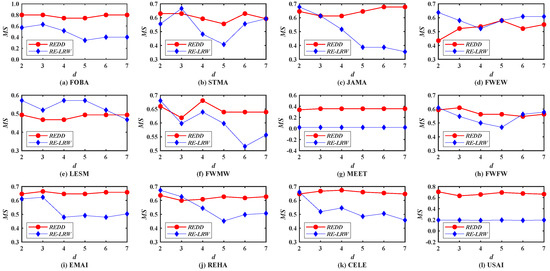 - From the results in Figure 2 and Figure 8, it can be seen that the MS and AUC curves of the RE-LRW and REDD indices change with the variation in dimension d. From the variation range for the corresponding curves, one can find that the REDD index has greater applicability in the most similar node mining and link prediction. This also proves that the conjecture and motivation are feasible in this paper.