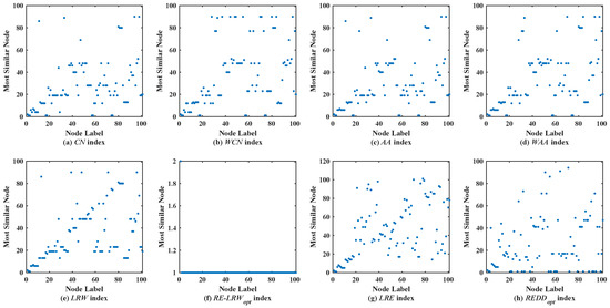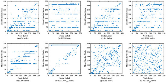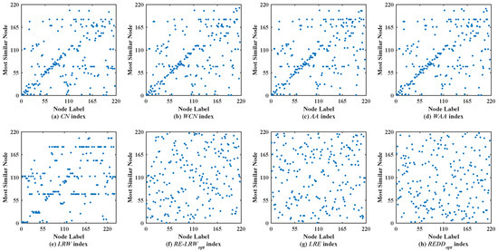 - According to the results from Figure 2, Figure 3, Figure 4, Figure 5, Figure 6 and Figure 7, we can find that the measurement results of the CN, WCN, AA, WAA, and LRW indices result in the situation that some nodes of a large degree become general similar nodes, while the relative entropy-based RE-LRW, LRE, and REDD indices better avoid the above-mentioned situation. Despite the scatter diagrams of the RE-LRW and LRE indices showing relatively better effects, they are not as good as the REDD index. This may be because the degree and strength of nodes are not fully considered in the definition of the RE-LRW and LRE indices.