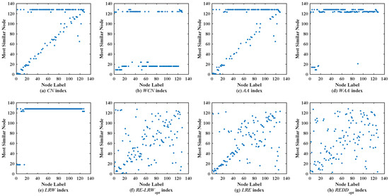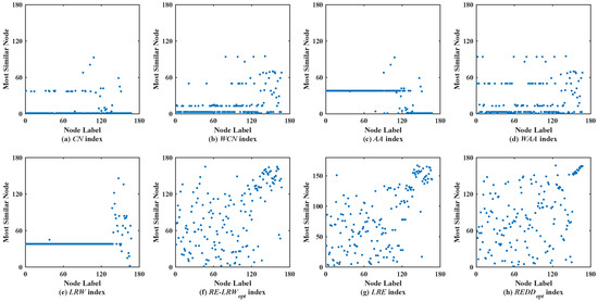 From Figure 7, the RE-LRW index can really avoid the situation that the nodes of a large degree become generally similar nodes. Unfortunately, the most similar nodes of many nodes are clustered in a straight line in the scatter diagram of the RE-LRW index. It indicates that the symmetry of RE-LRW index still has great room for enhancement in USAI. In the scatter diagram of the LRE index, many nodes are rarely distributed near the diagonal line, so the LRE index has a relatively better symmetry. As for the REDD index, most of the nodes are not distributed near the diagonal line in its scatter diagram, and many large nodes do not become general similar nodes. Overall, the REDD index performs better in the USAI, compared to the other benchmark indices.