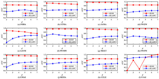 AUC curves of the REDD index and RE-LRW index with different dimensions d.