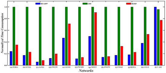Generally, the low complexity is a vital factor in the design of an algorithm. In view of the complexity of local indices being relatively lower, we merely compare the running time of the REDD, RE-LRW, and REDD indices in 12 weighted graph data. Next, the time consumption of the LRE, RE-LRW, and REDD indices are compared by using the metric: normalized time consumption [33]. The normalized time consumption can be understood as the running time of index a in graph data b being normalized in the interval [0,1]. The corresponding calculation formula is , where and are the running time and the normalized time consumption of index a in graph data b, respectively.