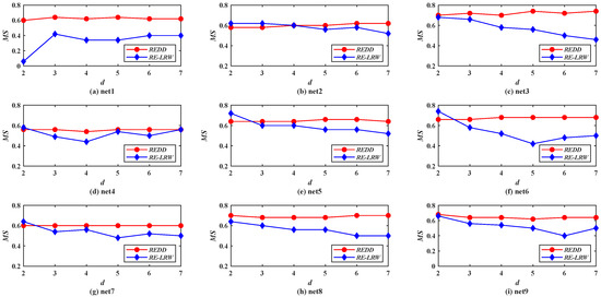 Figure 10 demonstrates the MS curves of the REDD and RE-LRW indices in nine simulated networks when the dimension d is changed from 2 to 7.