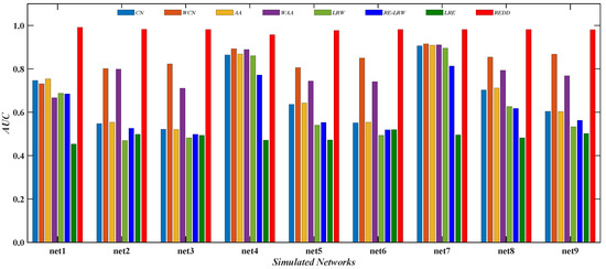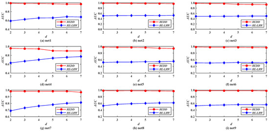 Figure 11 shows the AUC curves of the REDD and RE-LRW indices in nine simulated networks when the dimension d is changed from 2 to 7. From the results in Figure 11, it can be observed that the REDD index can be better than the RE-LRW index in accuracy and robustness.