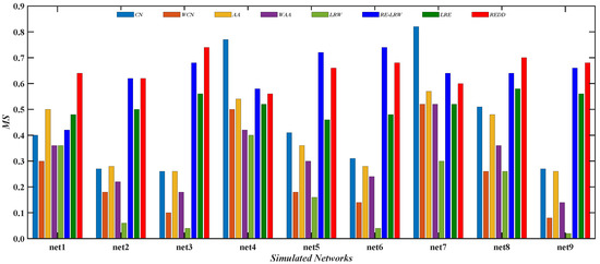 In this subsection, the performance of the REDD index and seven benchmark indices is analyzed. From the results of the CN, WCN, AA, and WAA indices, one can see that these only used the degree or strength of nodes are greatly affected by the strong and weak ties. Owing to the nodes of a large degree being more likely to be visited during the random walk, there are generally similar nodes in the measurement results of the LRW index. From the results of the RE-LRW, LRE, and REDD indices, it can be found that these indices use relative entropy and their own superior performance in the most similar nodes mining. Despite the results that the RE-LRW index is performed in MMET and USAI, it still has room for improvement. The REDD index comprehensively considers the degree and strength of nodes, while the LRW index only uses the degree of nodes. Hence, one can observe that the performance of the former is better than that of the latter from their results.