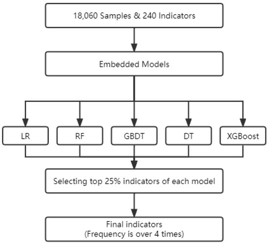 Finally, we decided to use embedded models by comparing strengths and limitations of three models, such as Logistic Regression (LR), Random Forest (RF), Gradient Boosting Decision Tree (GBDT), Decision Tree (DT), and Extreme Gradient Boosting (XGBOOST). Firstly, we inputed 240 indicators into each models and selected top 25% indicators at about 60 variables. Then, we selected the most frequent indicators by the frequency of those that occurred more than 4 times. This means that these are the most significant and relevant. The overall framework of feature selection is shown in Figure 2.