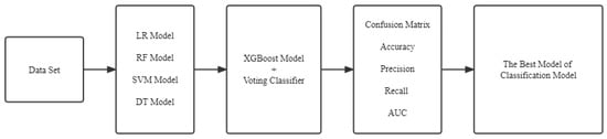 Voting is an effective and simple ensemble algorithm [,]. It is always used in the field of classification when created by combining with at least two or more sub-models. Each classifier model has its own function for testing. Finally, the output was predicted by the mean or the mode of the predictions. Voting classifier included two types, such as hard voting and soft voting. The former one is calculated on the predicted output class. Another one is calculated on the predicted probability of the output class. The framework is as shown in Figure 3.