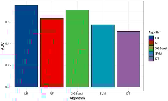 In Table 8, RF, XGBOOST, SVM, and DT have better performance in accuracy, recall, and precision compared with LR. In terms of accuracy, all models at over 97%, excluding LR model, for which the accuracy percentage was below 70%. At the same time, the other four models are higher than 97%. In addition, the recall of all models is at about 99%. Then, the precision of these are in the range of from 98% to 100%, excluding the LR model. In conclusion, these models can predict and detect the type of company effectively. However, the AUC value of the five models ranged from 0.50 to around 0.75. We plotted the AUC value as a bar chart to observe and select the best model as the basic model by using Voting in the next step as shown in Figure 4.