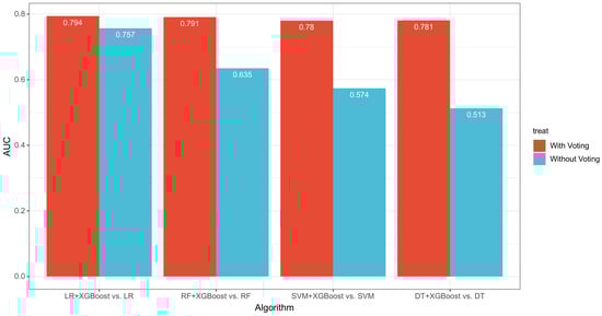 However, it is obvious that the AUC of ML models with Voting made an dramatic improvement and we plotted a bar chart in which this can be clearly observed, shown in Figure 5.