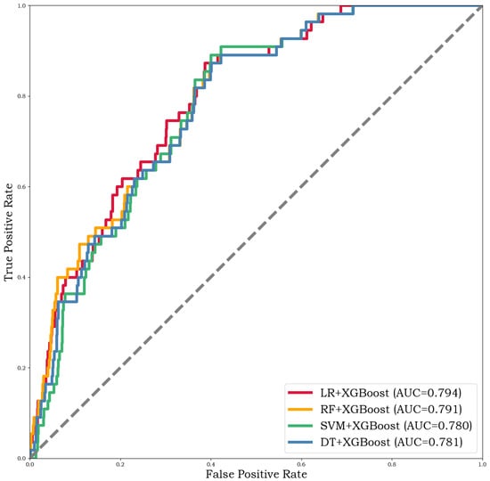 Therefore, we used the AUC value as the main metric to choose the optimal model due to the ensemble models performing similarly in terms of accuracy, recall, and precision. We also plotted the ROC curve as shown in Figure 6.