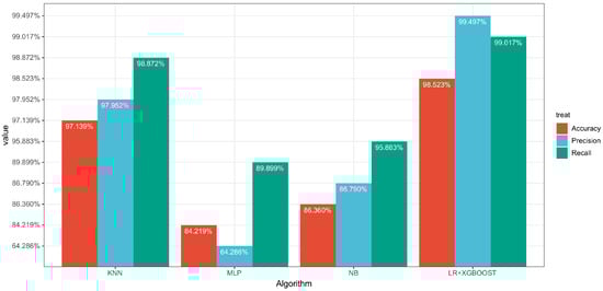 Figure 6 shows that LR+XGBOOST is the best model. As for accuracy, recall, and precision, the values are nearly 100%, respectively. This indicates that the proposed approach is valid and reliable.