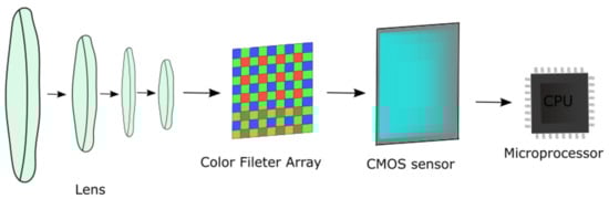 The most important component of the digital camera is the sensor. The sensor converts the captured light into electric signal to produce black, white, and gray pixels. The colors are obtained by applying a color filter array (CFA). The most used CFA is the Bayer Filter Array, which alternates the three colors red, green, and blue. Since our eyes are more sensitive to green, in the Bayer Filter Array, half of the array contains green filters, and the rest is split between red and blue. The digital cameras can have two types of sensors: a CCD (Charge-Coupled Device) sensor or a CMOS (Complementary Metal-Oxide Semiconductor) sensor. Since CMOS sensors are low power and less expensive than CCD sensors [1], the majority of smartphones are equipped with CMOS sensors, a reason for which we focus on such sensors alone in this work. In Figure 1, we depict the main components of the smartphone camera. The light passes through a lens and then goes through a color filter. The CMOS sensor converts the light corresponding to the three colors, red, green, and blue, into digital information.